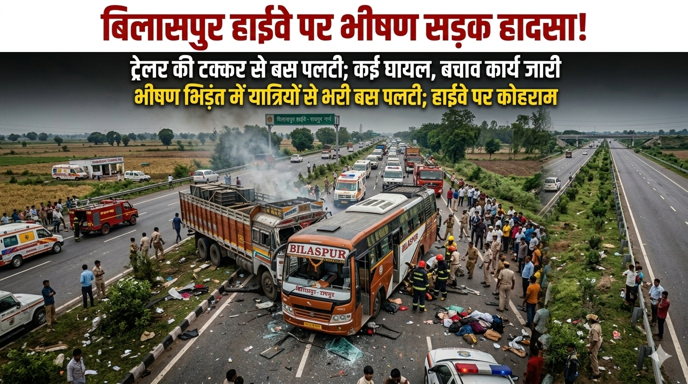 छत्तीसगढ़ के रायपुर–बिलासपुर नेशनल हाईवे पर शुक्रवार देर रात एक दर्दनाक सड़क हादसा हो गया। हादसा सिमगा के पास दरचूरा मोड़ पर हुआ, जहां तेज रफ्तार ट्रेलर ने पीछे से यात्री बस को जोरदार टक्कर मार दी। टक्कर इतनी जबरदस्त थी कि बस अनियंत्रित होकर हाईवे से नीचे उतरकर पलट गई और उसके परखच्चे उड़ गए।प्राप्त जानकारी के अनुसार, यात्री बस रायपुर से बिलासपुर की ओर जा रही थी। इसी दौरान सिमगा से करीब 10 किलोमीटर आगे दरचूरा मोड़ के पास पीछे से आ रहे ट्रेलर ने बस को टक्कर मार दी। हादसा लगभग सवा ग्यारह बजे के आसपास हुआ बताया जा रहा है।इस हादसे में अब तक 4 लोगों की मौत की पुष्टि हुई है। मृतकों में दो पुरुष, एक महिला और एक बच्चा शामिल बताए जा रहे हैं। वहीं एक दर्जन से अधिक यात्री घायल हो गए हैं। बस में करीब दो दर्जन से ज्यादा यात्री सवार थे।हादसे के बाद आसपास के ग्रामीण और राहगीर तुरंत मौके पर पहुंचे और राहत कार्य शुरू किया। स्थानीय लोगों की मदद से बस में फंसे यात्रियों को बाहर निकाला गया। सूचना मिलने के बाद पुलिस और प्रशासन की टीम भी मौके पर पहुंच गई।घायलों को तत्काल एंबुलेंस की मदद से सिमगा के सामुदायिक स्वास्थ्य केंद्र पहुंचाया गया, जहां उनका इलाज किया जा रहा है। गंभीर रूप से घायल कुछ यात्रियों को बेहतर उपचार के लिए अन्य अस्पतालों में रेफर किया गया है।पुलिस के अनुसार हादसे के कारणों की जांच की जा रही है। प्रारंभिक तौर पर ट्रेलर की तेज रफ्तार और टक्कर को हादसे की वजह माना जा रहा है, हालांकि पुलिस पूरे मामले की जांच कर रही है। प्रशासन मृतकों की पहचान करने और घायलों को हर संभव मदद उपलब्ध कराने में जुटा हुआ है।