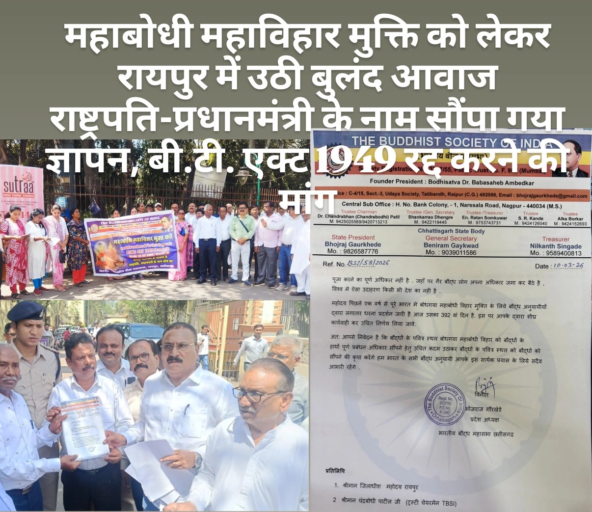 रायपुर। बोधगया स्थित विश्व प्रसिद्ध महाबोधी महाविहार को गैर-बौद्धों के नियंत्रण से मुक्त कराने और बोधगया मंदिर अधिनियम 1949 (बी.टी. एक्ट) को रद्द करने की मांग को लेकर भारतीय बौद्ध महासभा रायपुर (छत्तीसगढ़) ने जोरदार पहल करते हुए रायपुर जिला कलेक्टर के माध्यम से राष्ट्रपति और प्रधानमंत्री के नाम ज्ञापन सौंपा। महासभा ने मांग की कि महाबोधी महाविहार का पूर्ण प्रबंधन बौद्ध समाज को सौंपा जाए, ताकि इस पवित्र स्थल का संचालन बौद्ध परंपराओं और आस्था के अनुरूप हो सके।ज्ञापन में कहा गया है कि बोधगया का महाबोधी महाविहार विश्व के करोड़ों बौद्ध अनुयायियों की आस्था का केंद्र है, जहां भगवान बुद्ध को ज्ञान की प्राप्ति हुई थी। ऐसे ऐतिहासिक और पवित्र स्थल के प्रबंधन में बौद्ध समाज की निर्णायक भूमिका होना अत्यंत आवश्यक है। वर्तमान व्यवस्था में लागू बोधगया मंदिर अधिनियम 1949 के कारण महाविहार के प्रबंधन में गैर-बौद्धों की भागीदारी बनी हुई है, जिसे बौद्ध समाज अपनी धार्मिक भावनाओं के विपरीत मानता है।भारतीय बौद्ध महासभा ने अपने ज्ञापन में स्पष्ट रूप से मांग की कि बी.टी. एक्ट 1949 को समाप्त कर महाबोधी महाविहार का संपूर्ण प्रबंधन बौद्ध समाज को सौंपा जाए। महासभा का कहना है कि यह केवल धार्मिक आस्था का विषय नहीं, बल्कि बौद्ध समाज के अधिकारों और सम्मान से जुड़ा महत्वपूर्ण मुद्दा है।ज्ञापन में यह भी उल्लेख किया गया कि पिछले एक वर्ष से पूरे भारत में बोधगया महाबोधी विहार मुक्ति को लेकर बौद्ध अनुयायियों द्वारा लगातार धरना-प्रदर्शन किया जा रहा है और यह आंदोलन आज 392वें दिन में प्रवेश कर चुका है। इसके बावजूद अब तक कोई ठोस निर्णय नहीं लिया गया है, जिससे बौद्ध समाज में आक्रोश और निराशा बढ़ रही है।महासभा ने सरकार से अपील की कि बौद्धों के इस पवित्र स्थल को बौद्ध समाज के हाथों पूर्ण प्रबंधन अधिकार सौंपने के लिए शीघ्र और ठोस कदम उठाए जाएं। ज्ञापन में यह भी कहा गया कि यदि सरकार इस दिशा में सकारात्मक निर्णय लेती है तो देश और दुनिया भर के सभी बौद्ध अनुयायी इस सार्थक पहल के लिए सदैव आभारी रहेंगे।इस दौरान भारतीय बौद्ध महासभा के प्रदेश अध्यक्ष भोजराज गौरखेड़े, महासचिव बेनीराम गायकवाड़, ट्रस्टी अलका ताई बोरकर, जिला अध्यक्ष प्रकाश रामटेके, महासचिव विजय गजघाटे, कोषाध्यक्ष जी.एस. मेश्राम तथा समता सैनिक दल के दिलीप रागासे उपस्थित रहे।ज्ञापन सौंपते समय रायपुर शहर के विभिन्न वार्डों के बौद्ध एवं सामाजिक संगठनों के प्रतिनिधि भी बड़ी संख्या में मौजूद रहे और उन्होंने एकजुट होकर महाबोधी महाविहार को बौद्धों के अधिकार में सौंपने की मांग का समर्थन किया।