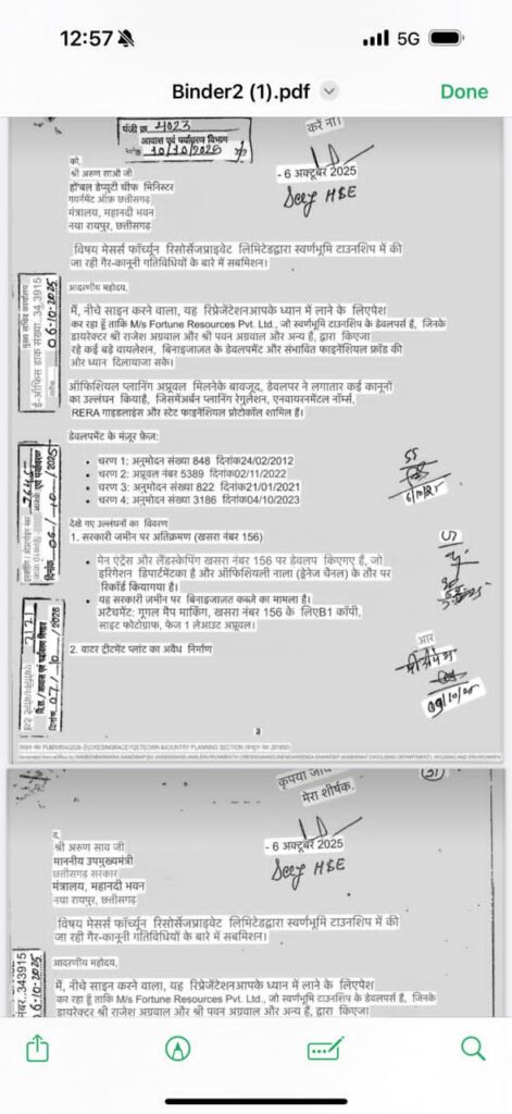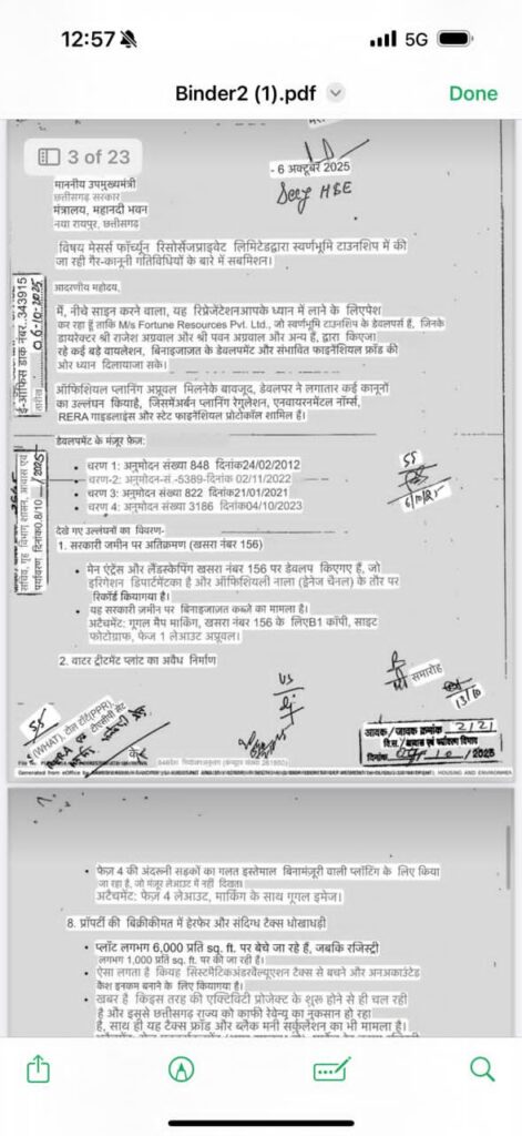 रायपुर: राजधानी रायपुर स्थित स्वर्णभूमि टाउनशिप को लेकर गंभीर आरोप सामने आए हैं। टाउनशिप के डेवलपर Fortune Resources Pvt. Ltd. के खिलाफ अवैध निर्माण, सरकारी जमीन पर अतिक्रमण, अनधिकृत प्लॉटिंग और टैक्स से जुड़ी अनियमितताओं की शिकायत राज्य सरकार से की गई है।