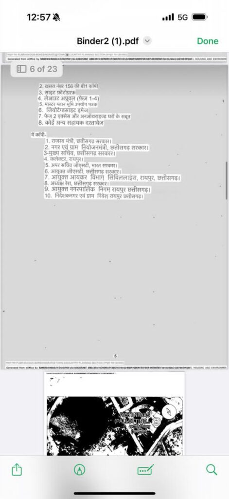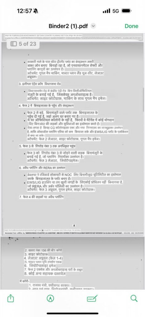 कई विभागों को भेजी गई शिकायतइस मामले की जानकारी राज्य सरकार के कई विभागों और अधिकारियों को भी भेजी गई है, जिनमें राजस्व विभाग, नगर एवं ग्राम नियोजन विभाग, मुख्य सचिव कार्यालय, जिला प्रशासन रायपुर, GST विभाग, आयकर विभाग और नगर निगम रायपुर शामिल हैं।शिकायत के साथ गूगल मैप मार्किंग, साइट फोटोग्राफ, लेआउट अप्रूवल, मास्टर प्लान भूमि उपयोग पत्रक और जियोटैग्ड साइट इमेज सहित कई दस्तावेज भी संलग्न किए गए हैं।अब यह देखना महत्वपूर्ण होगा कि प्रशासन इस शिकायत पर किस प्रकार की जांच करता है और आरोपों को लेकर आगे क्या कार्रवाई की जाती है।