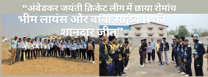 रायपुर। डॉ. अंबेडकर जयंती क्रिकेट लीग में खेले गए मुकाबलों में भीम लायंस रोटरी नगर और बाबा साहेब 11 ने शानदार जीत दर्ज की। पहले मैच में भीम लायंस ने 94 रन का लक्ष्य 3 गेंद शेष रहते हासिल किया, जिसमें निर्मल बांसोड़ ने 47 रन की बेहतरीन पारी खेली और प्लेयर ऑफ द मैच बने। वहीं दूसरे मैच में बाबा साहेब 11 ने आनंद बुद्ध विहार को 65 रन पर रोककर आसानी से लक्ष्य हासिल कर लिया, जिसमें लक्की कठाणे को प्लेयर ऑफ द मैच चुना गया।